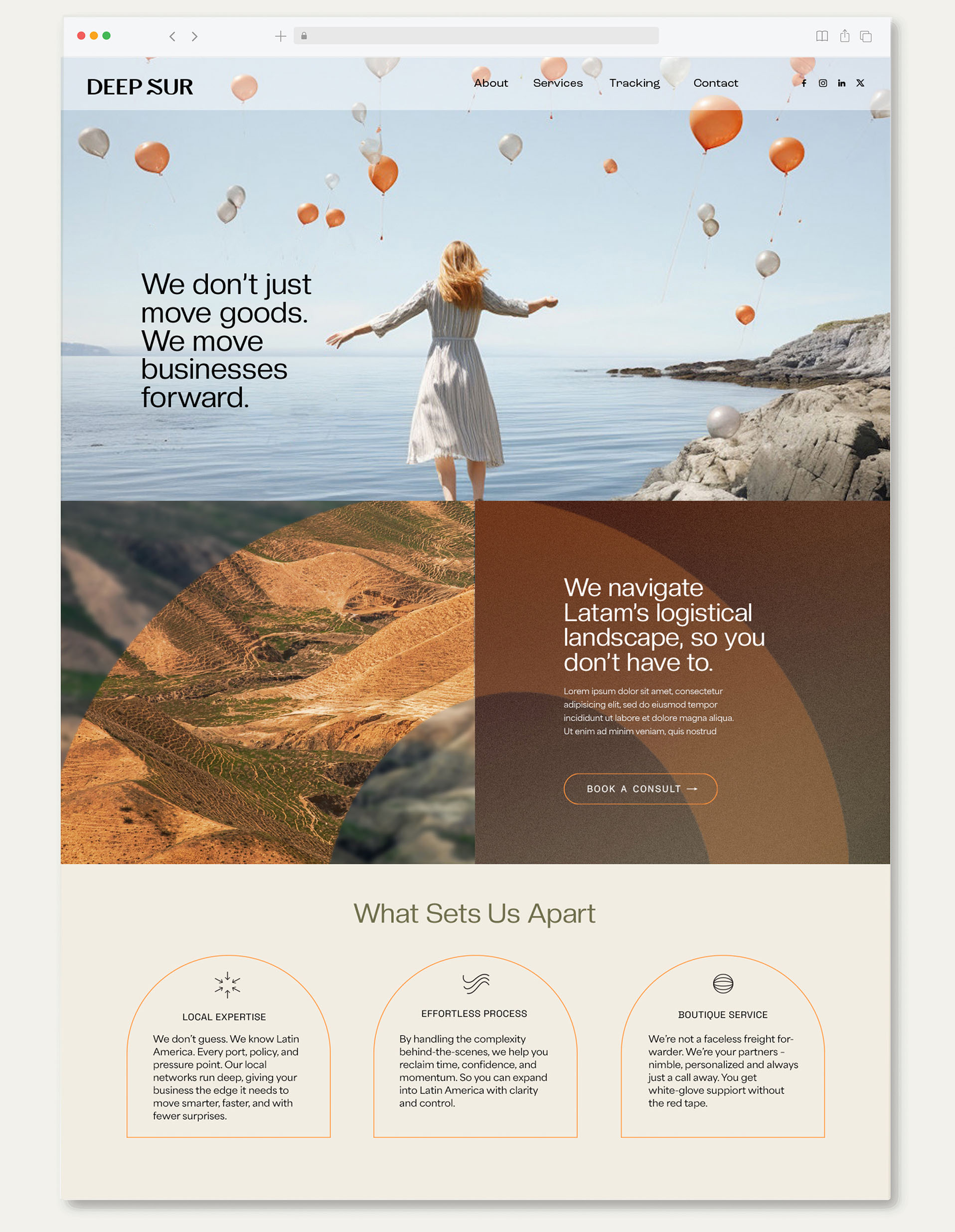 We delivered a comprehensive branding program for Deep Sur, an international trade and logistics company. This included the development of brand identity and strategy, copywriting, style guide, PowerPoint template design, and website design.